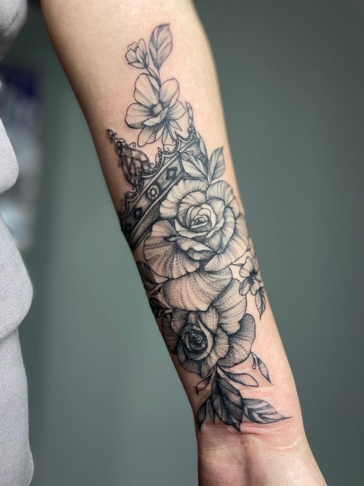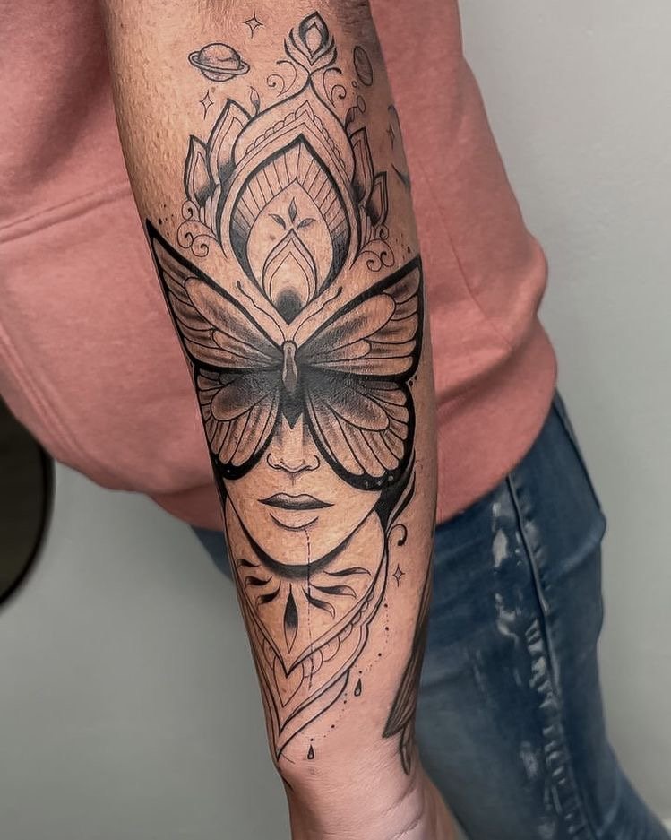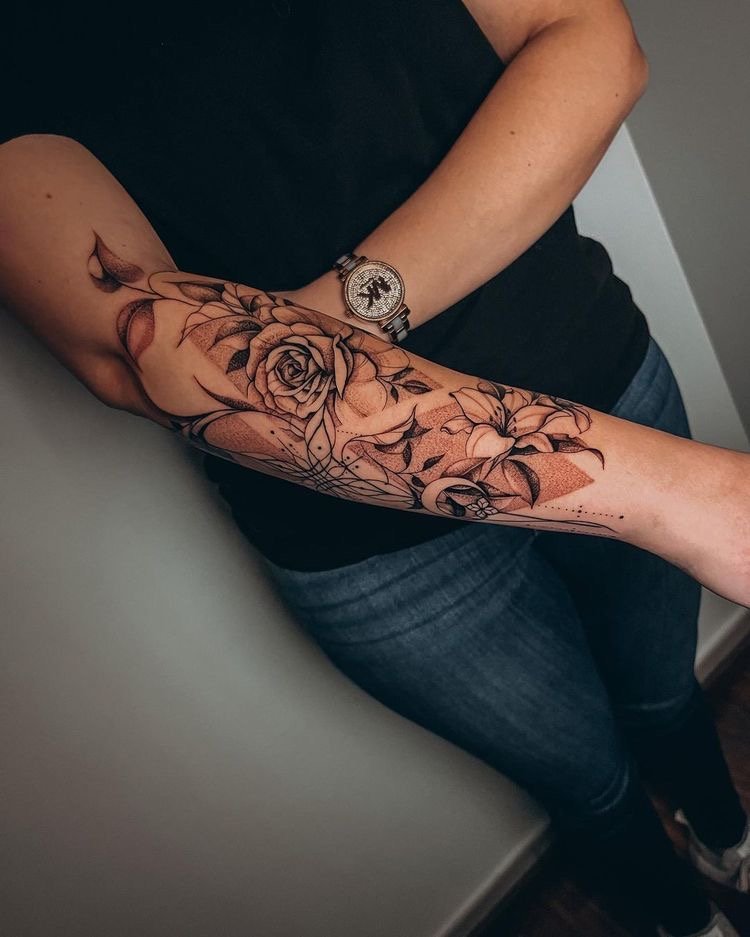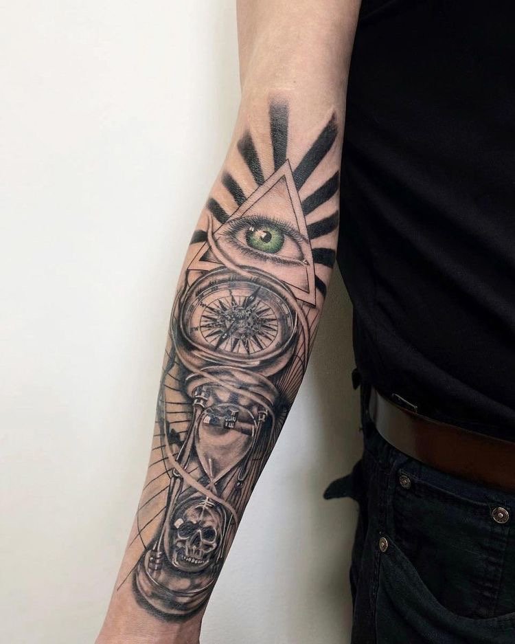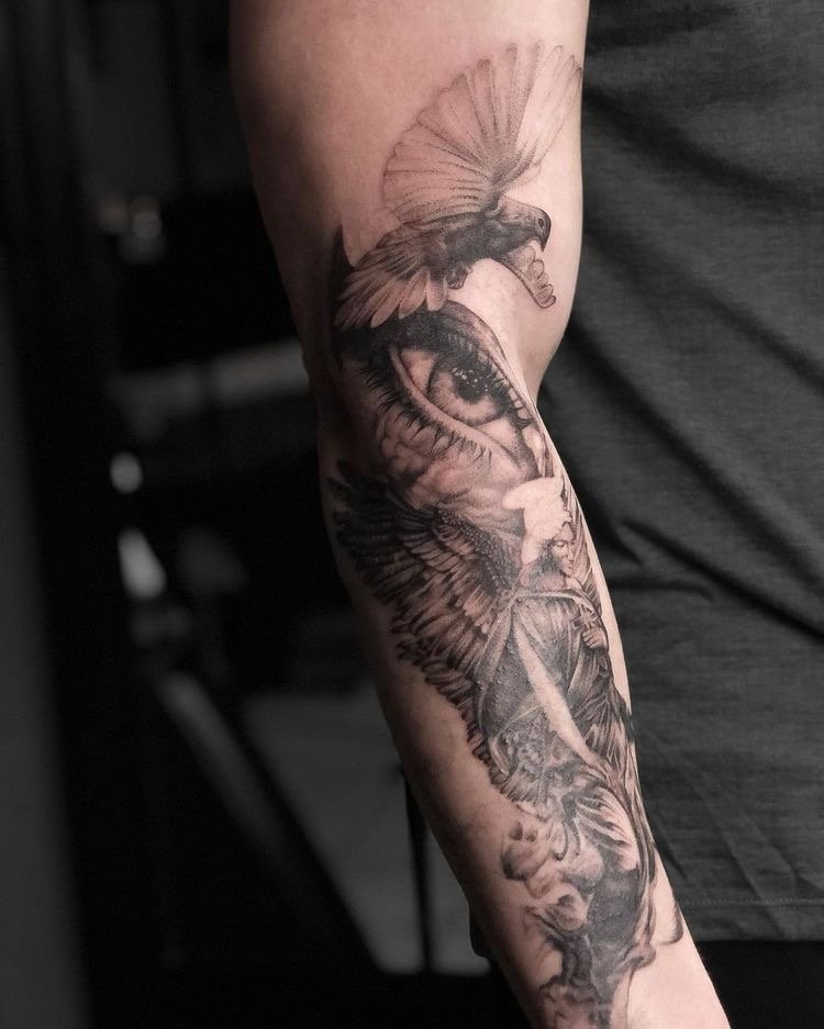 Shoulder (it is about the outer side) and forearm are not only the most popular, but also the most practical places for getting a tattoo. In these areas the sensitivity is lower and this part of the hand does not touch the body. It reduces the irritation of the injured skin. Also, these tattoos can be hidden under clothes if it is necessary (even if you have a sleeve, but only if it does not go beyond the wrist).