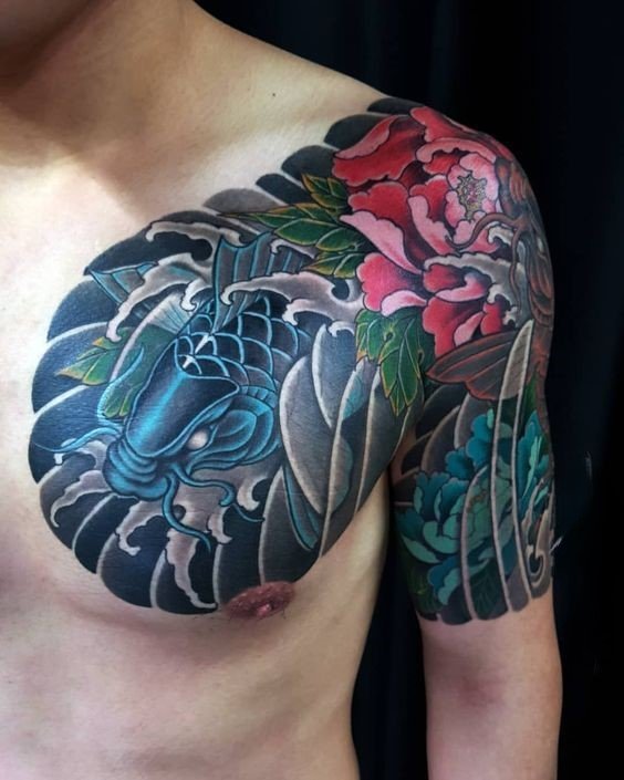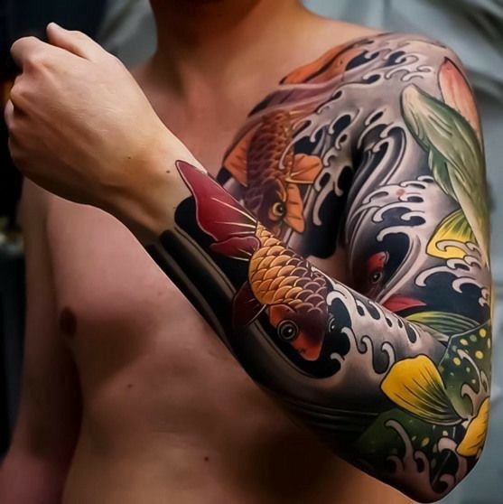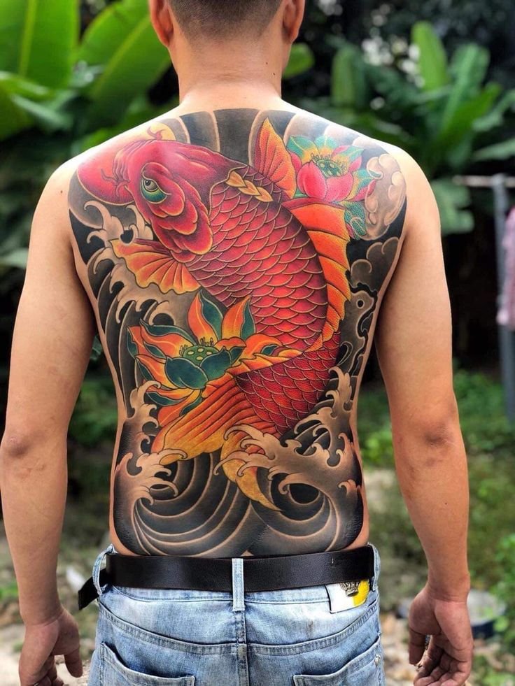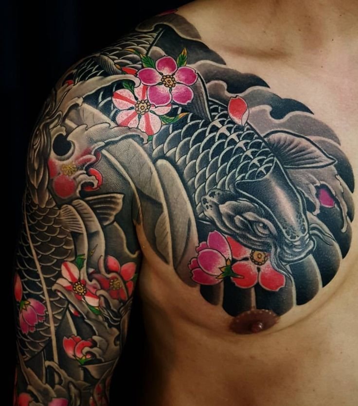 - Koi Carp — another significant symbol, representing determination and endurance. According to legends, a koi carp can transform into a dragon if it overcomes the river's current. In tattoos, koi are often depicted struggling against the current of water, symbolizing a person's effort to overcome difficulties on their path.