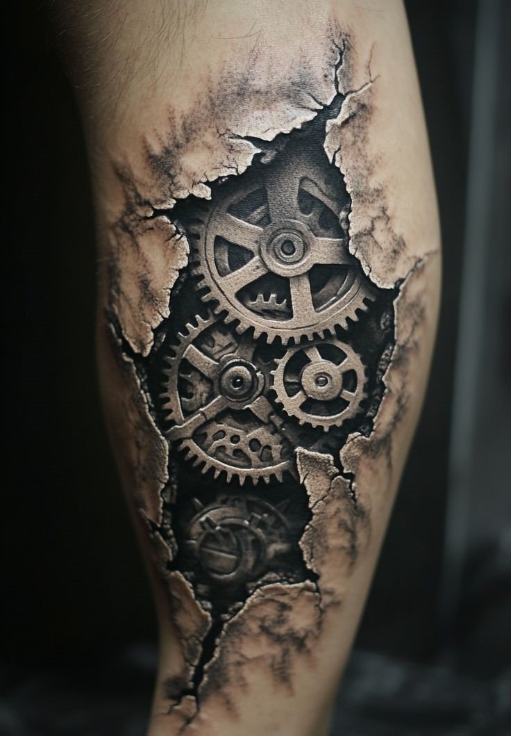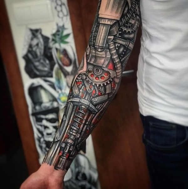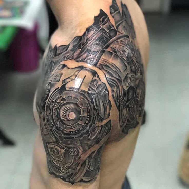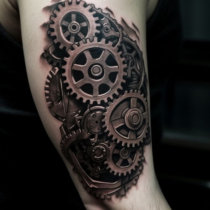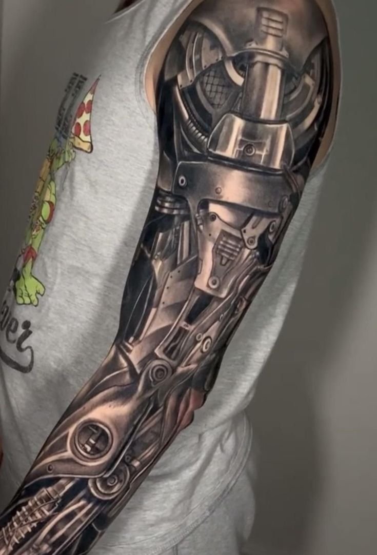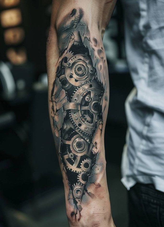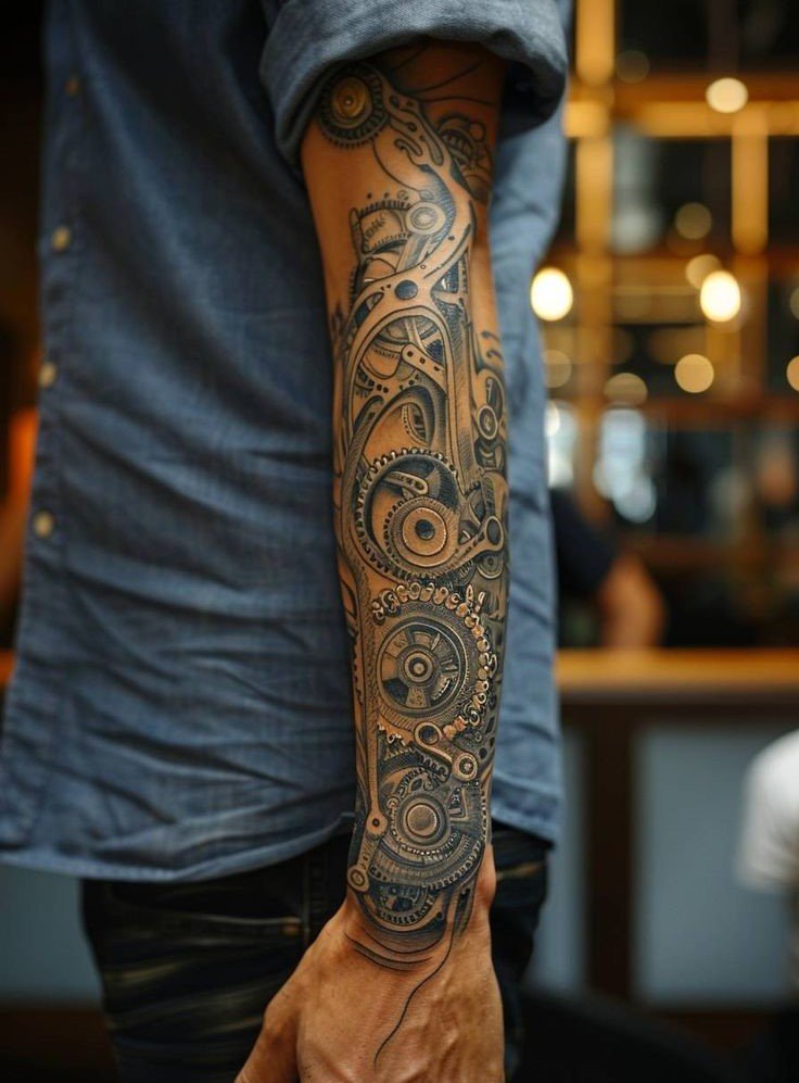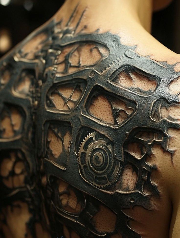 These elements require not only a high level of skill and precision from the tattoo artist but also a deep understanding of human anatomy to make the integration of mechanical details appear as realistic as possible.