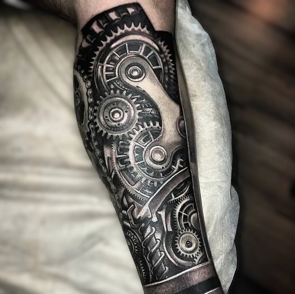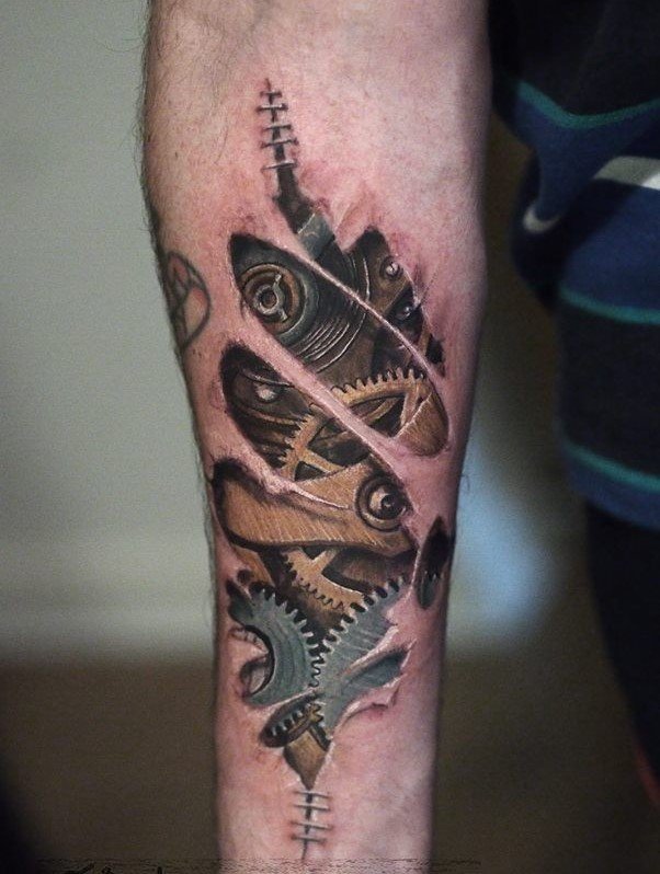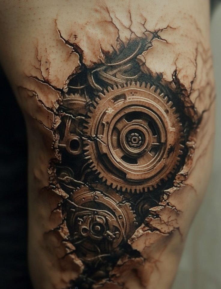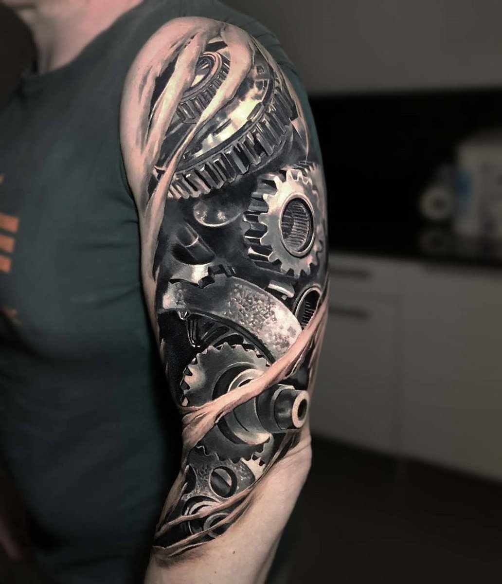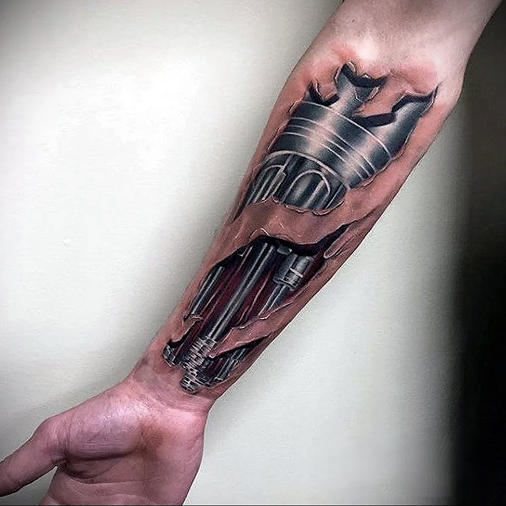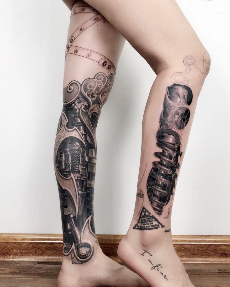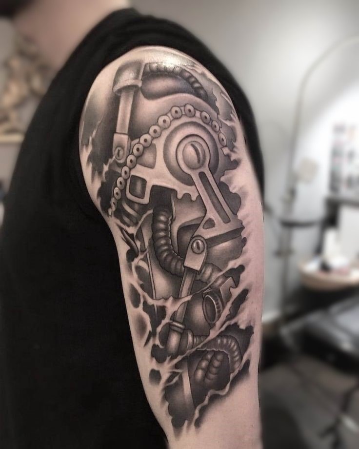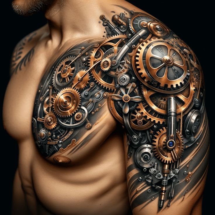 These elements require not only a high level of skill and precision from the tattoo artist but also a deep understanding of human anatomy to make the integration of mechanical details appear as realistic as possible.