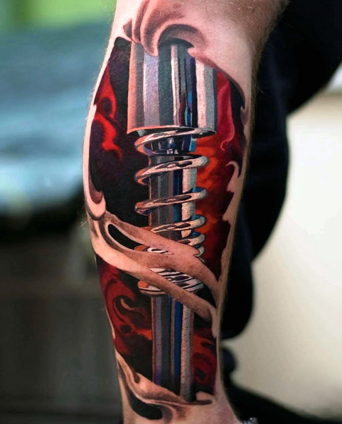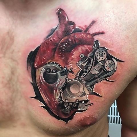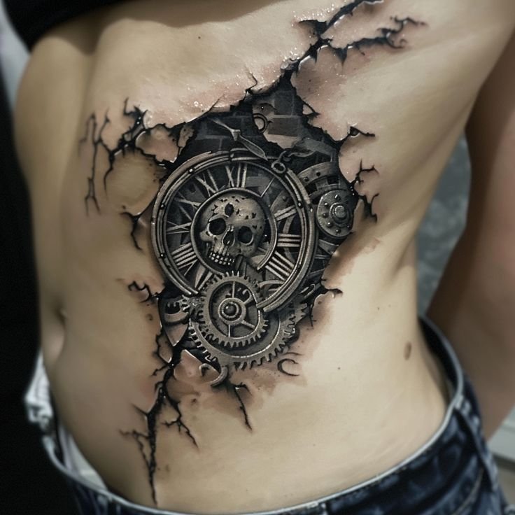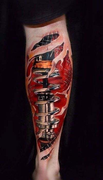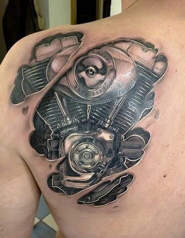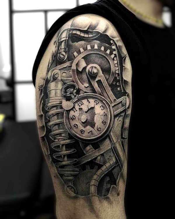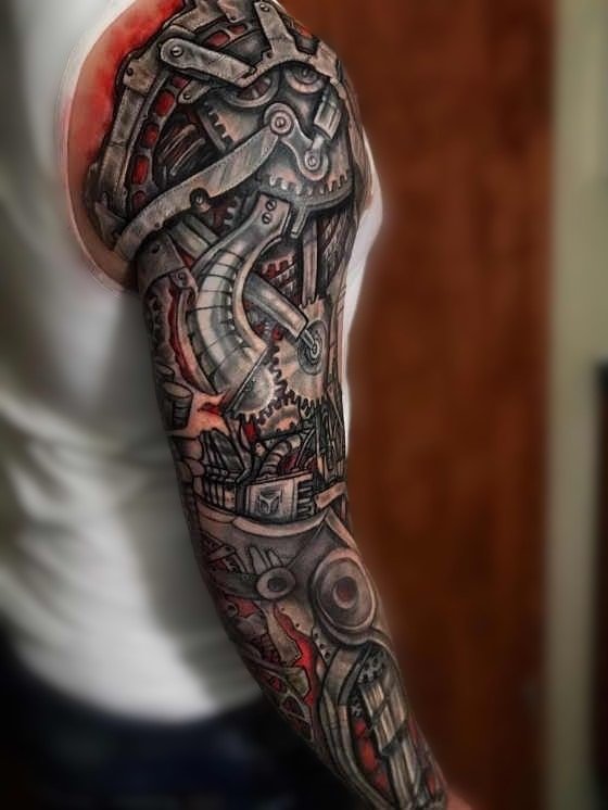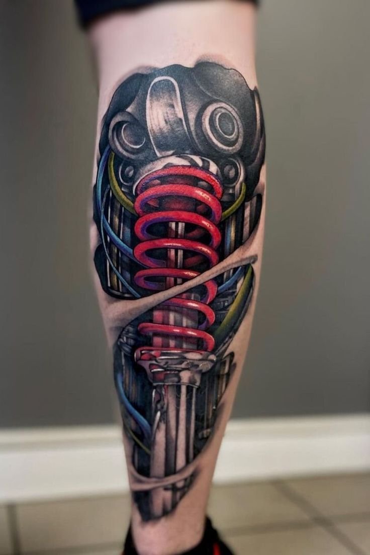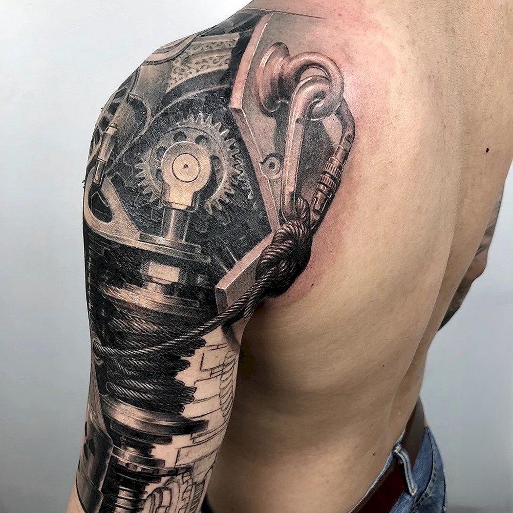 These elements require not only a high level of skill and precision from the tattoo artist but also a deep understanding of human anatomy to make the integration of mechanical details appear as realistic as possible.
