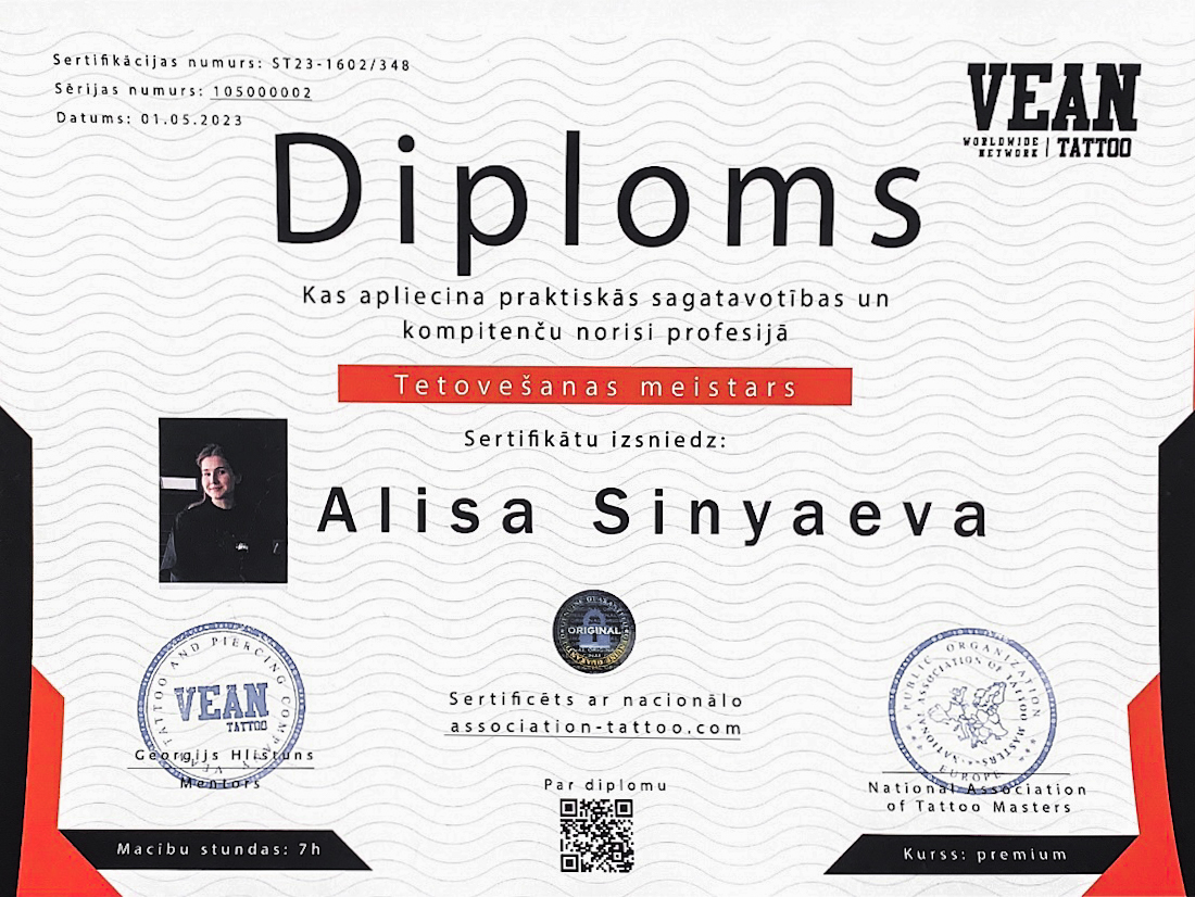 Es esmu Alisa, tetovējumu meistare ar vairāk nekā 2,5 gadu pieredzi. Vēlos radīt mākslu visās tās formās - tieši tetovēšana man ir vistuvākais un dzīvākais veids, kā to darīt. Katru darbu veicu ar sirdi un uzmanību pret detaļām. Būšu priecīga ar tevi sadarboties!