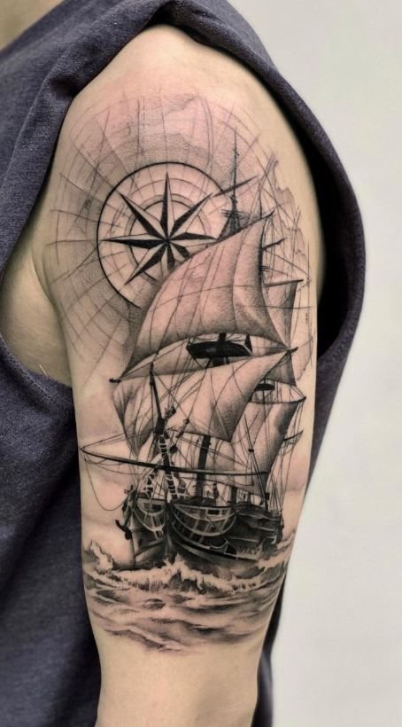 - Kuģis. Kuģis ir piedzīvojumu, jaunu atklājumu un mīlestības pret jūru simbols. Šis tetovējums var simbolizēt mīlestību pret ceļošanu vai cilvēka dzīves ceļu, kas ir pilns ar pārbaudījumiem un atklājumiem.