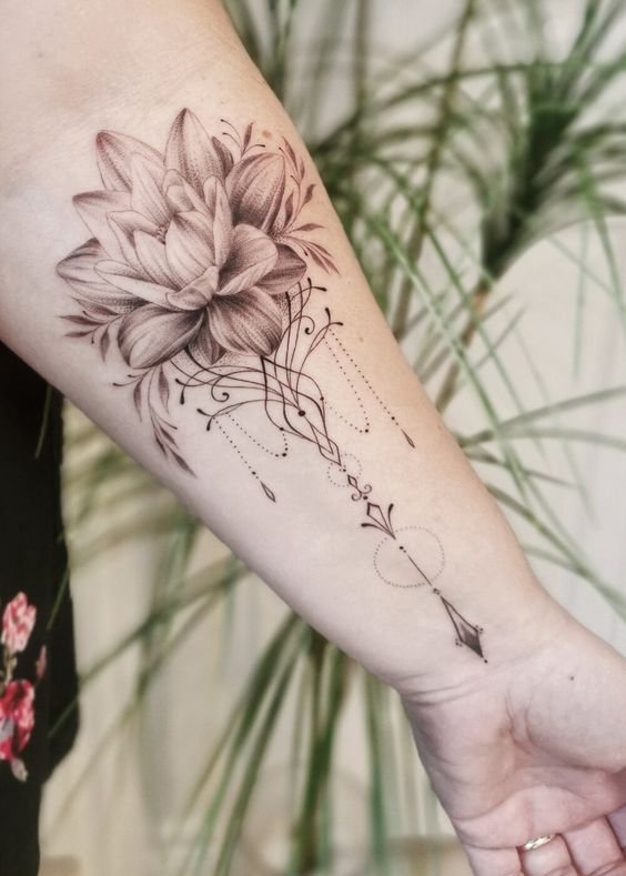 Šāda Lotosa tetovējuma skice ne tikai simbolizē skaistumu un pievilcīgumu, tai ir dziļa simboliskā nozīme.