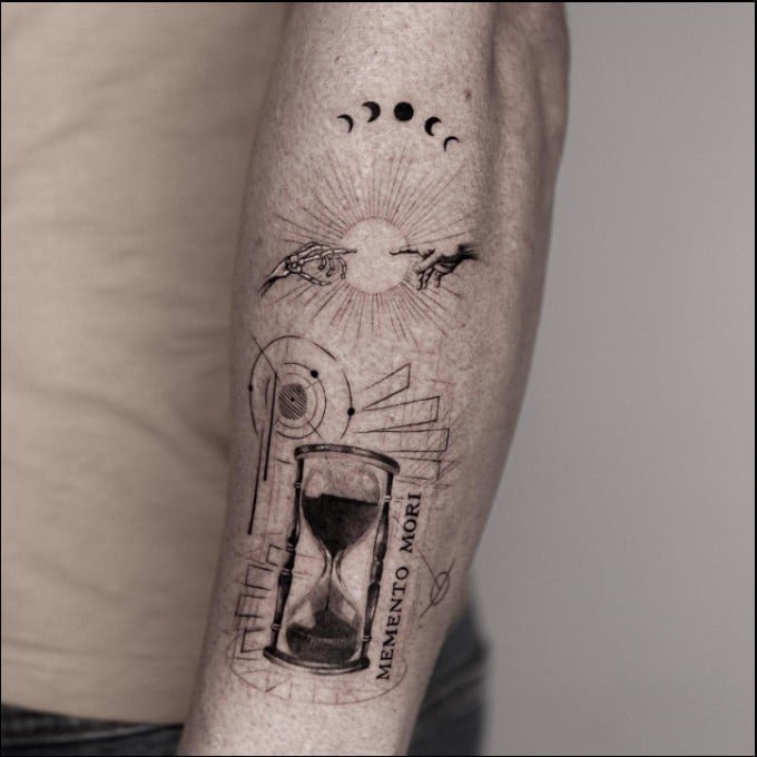 Memento Mori tetovējumus var apvienot ar dažādiem simboliem un elementiem, lai izveidotu unikālu un daudzslāņainu dizainu: