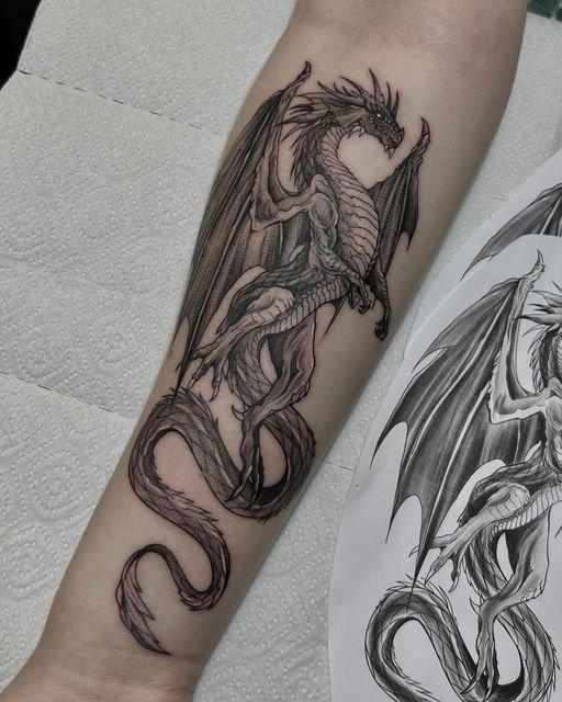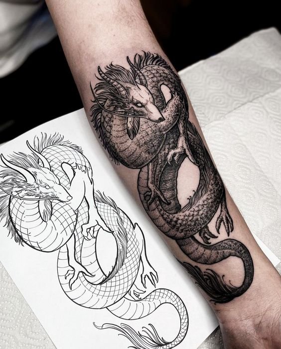 Kad Pūķa tetovējuma skice ir izvēlēta, kopā ar meistaru noskaidrotas visas darba detaļas, attēla izmērs – var ķerties pie atrašanās vietas.